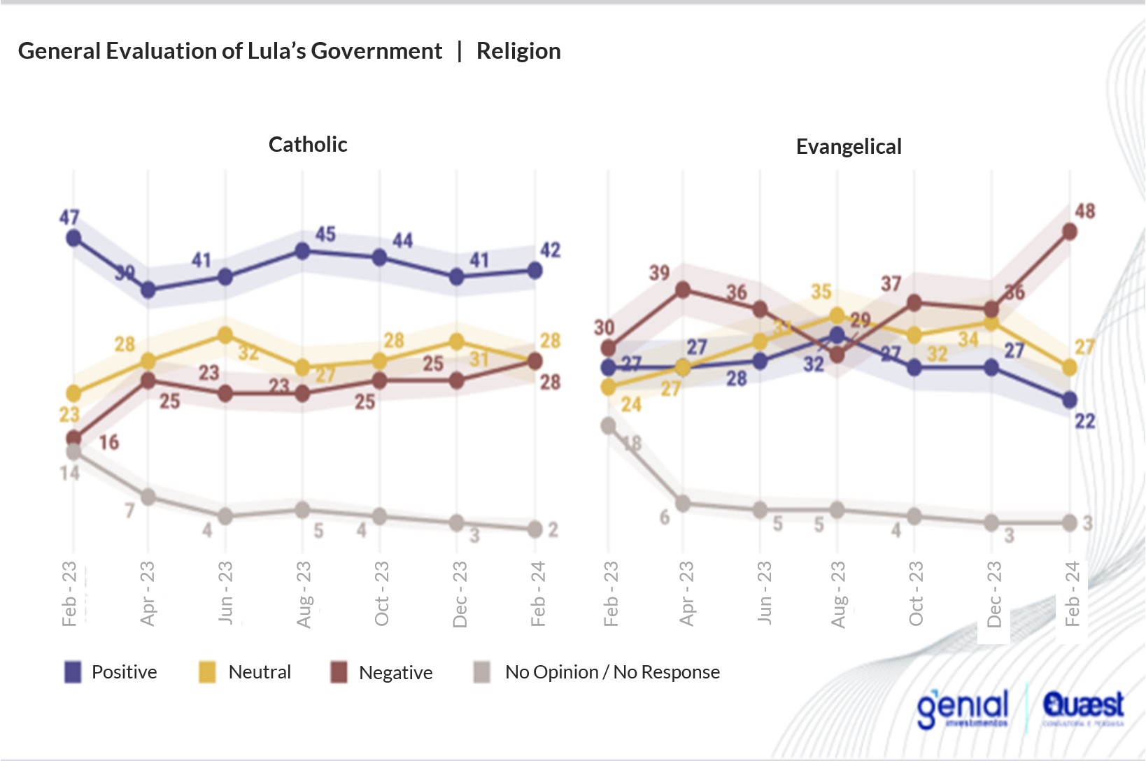 Voter concerns are centered on inflation, trust in economic management, and the impact of high interest rates (SELIC) on household budgets. Ideological issues include public security and religious values. Evangelicals have shifted strongly against the government, driven by opposition to policies conflicting with their beliefs. Approximately 27% attribute Brazil's crisis to 'Satan'.