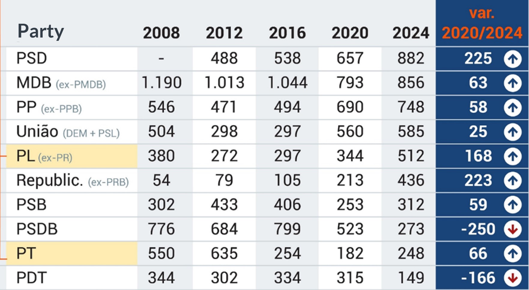 Bolsonaro continues to dominate 35-40% of the right-wing electorate, complicating the consolidation of a single candidacy as the right expands and strengthens. Regarding this last point, municipal elections are a key metric of political influence. Considering the last election in 2024, the Workers' Party (PT) gained only 66 new mayors, while the Liberal Party (PL, associated with Bolsonarism) secured 168. The right is expected to achieve a major victory in the Chamber of Deputies. With control of five right-wing parties, they can pass virtually any legislation. Bolsonaro personally influences the selection of 15-20 senators (e.g., Senator Moura), which has significant implications for fiscal matters and structural reforms.